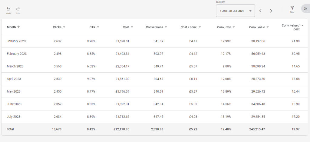 The second account example is an e-commerce client, so as well as highlighting the importance of conversions, both the amount of sales revenue that we generate “Total conv. value”, as well as the return on ad spend “conv. value / cost” are crucial metrics for their business growth.