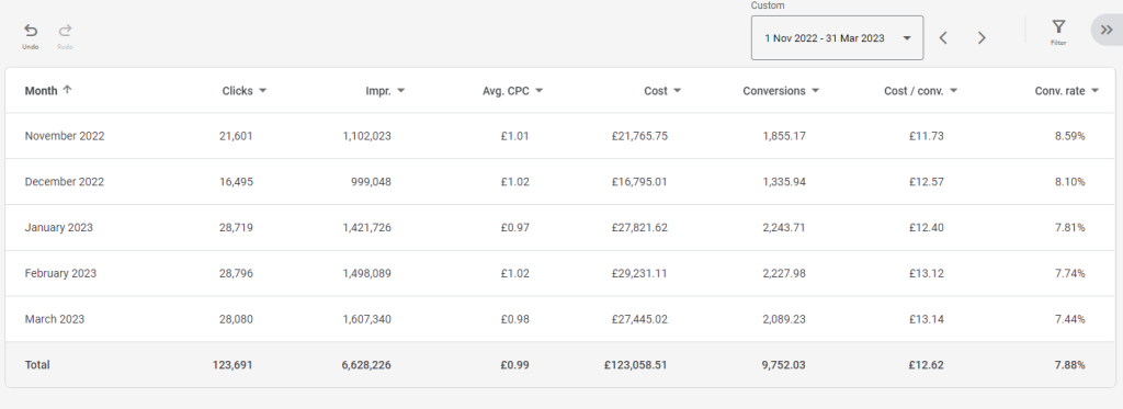 Below you can see a few examples of client accounts that illustrate month-on-month conversion growth. These are extracted directed at source from Google Ads campaign data and sorted “by month” – Our particular focus and optimisations strategies are all bespoke, and will be based on the client brief and the areas that need improvement to increase overall results.